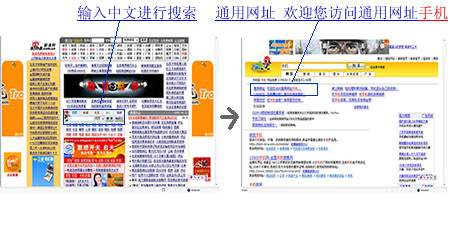 以网易为例: 用户在网易的网站搜索中输入搜索词,点击搜索按钮后出现网易的搜索结果,在搜索结果的首行,有通用网址的文字链接,点击此文字链即可实现访问通用网址的功能。